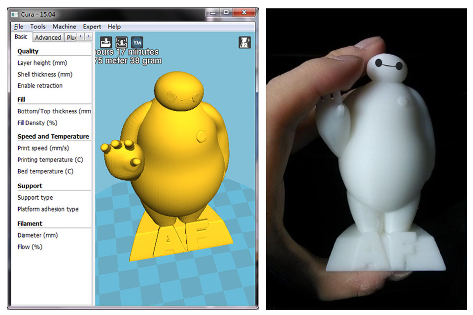 女儿超喜欢大白,网上玩具店买过不少,毛绒的、充气的、手办的,但小家伙还是想要各种大白,还要我扮大白。。。。终于,我用3D打印机为她打印出了漂亮的大白,女儿亲眼看到大白一点点的从那个神奇的机器里冒出来,整天捧在手里爱不释手,有一天,她捧着我打印的大白在我耳边说:“爸爸!你就是我的大白…….!”从此,用3D打印机为女儿打印玩具,成了我生活中的一种乐趣,3D打印的乐趣和用途远不止这些,请详细浏览本网站的内容,也许能给你和你的朋友和孩子带来更多的惊喜!