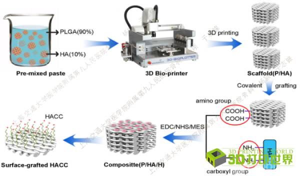 在骨科临床上,大段的骨缺损常伴有伤口的污染或开放,存在较高的感染风险。植入的材料在某种程度上也创造了细菌粘附生长的载体或微环境,细菌可在其表面形成生物膜,而生物膜的形成是感染发生的关键环节。近期,上海交通大学医学院附属第九人民医院骨科汤亭亭教授团队利用3D打印方法,制备了聚乳酸-羟基乙酸共聚物/羟基磷灰石(PLGA/HA)复合多孔生物支架并表面接枝壳聚糖季铵盐(HACC);体内外研究表明,该人工骨组织修复支架不仅具有很好的成骨能力,还兼具良好的抗菌活性。