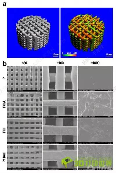 如图1所示,研究人员首先利用3D打印技术制备多孔立体PLGA/HA支架,然后将课题组前期研发的具有显著抗菌活性的HACC以共价键结合的方式接枝于复合支架材料上。该3D打印支架的孔隙率为80%左右,孔隙连通率接近100%,孔径为320μm左右;接枝的HACC可随支架材料的降解而缓慢释放,4周模拟体液浸泡后,HACC总缓释量等于其初始负载量的70%左右。