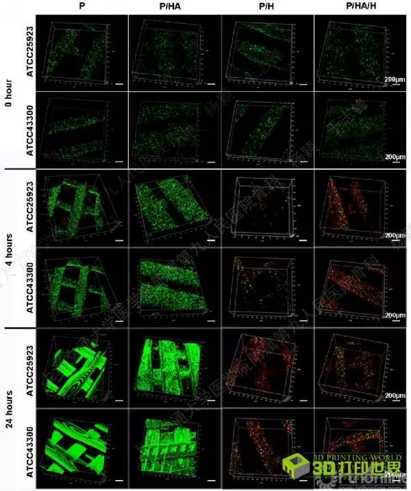 研究人员随后将打印的支架材料分为四组(P:单纯PLGA;P/HA:PLGA-HA;P/H:PLGA-HACC;P/HA/H:PLGA-HA-HACC)开展体外细菌学和细胞学试验。首先通过金葡菌及其耐药菌株接种及死/活细菌染色发现,接枝HACC的支架(P/H和P/HA/H)均可显著抑制细菌的早期粘附和生物膜形成。