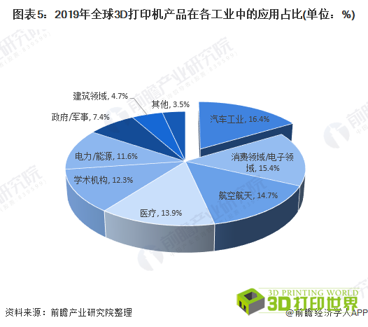 3D打印下游应用领域方面,据《Wohlers Report 2020》问卷调查显示,目前工业中使用3D打印最多的行业是汽车工业,遥遥领先,占比为16.4%。消费领域/电子领域和航空航天则紧随其后,分别为15.4%和14.7%。