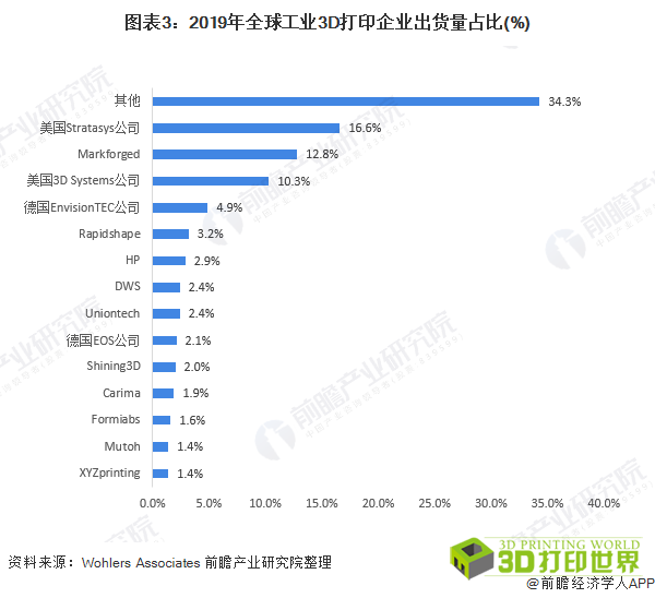3D打印公司产品出货量方面,2019年全球工业3D打印企业一共销售了超过2.2万台工业3D打印系统,比2018年增长了14.7%。在全球企业工业级3D打印设备出货量排行榜中,美国Stratasys公司的出货量占据榜首。除了美国Stratasys公司,美国3D Systems公司位列第三位。