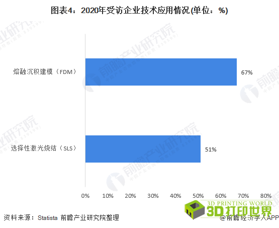 3D打印产业规模增长与3D打印技术密切相关。根据知名数据公司Statista于2020年6月3日公布的数据,2020年,全球最常用的3D打印技术是熔融沉积建模(FDM),67%的受访者在室内使用该技术。选择性激光烧结(SLS)是2020年第二大最常用的技术,51%的受访者通过外部服务采用这种技术。