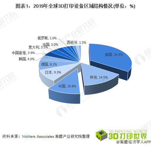 全球范围内,美国3D打印技术先进,3D打印设备规模领先其他国家。据Wohlers Associates数据,2019年美国3D打印机安装量占全球34.4%,约为中国的3倍。
