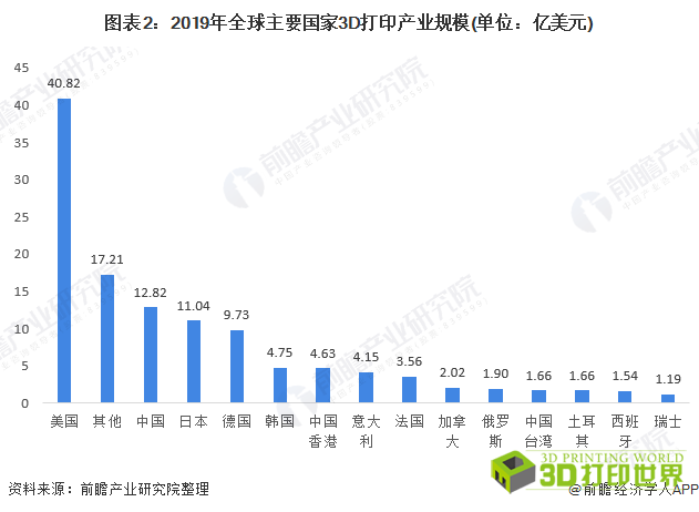 美国是3D打印产业的起源地,在全球3D打印市场中持续领先。以全球3D打印产业规模与各国3D打印设备出货量占比进行测算可知,2019年美国3D打印产业规模为40.82亿美元,全球范围内,美国3D打印产业规模领先其他国家。