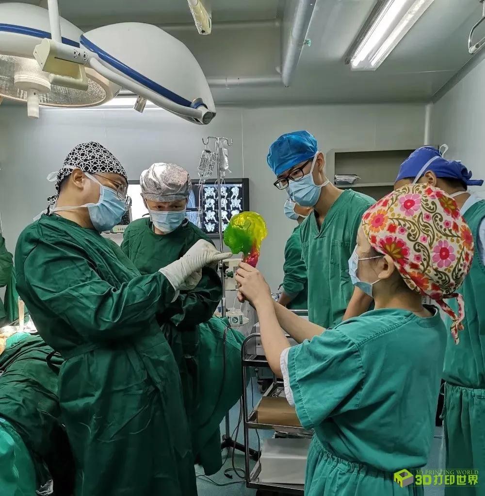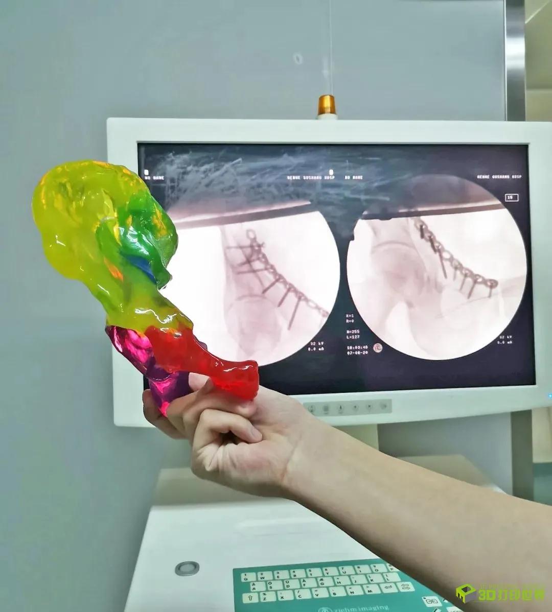 全彩透明的3D打印模型术中起到导航作用,手术医生可直接模拟和估计出视野看不见的部位的情况和复位的方向,尤其是植入螺钉时可以很好地指示方向、预估螺钉长度,避免螺钉进入关节内。实现一次置钉成功,减少术中辐射、手术时间从预计的十小时缩减至五小时。
