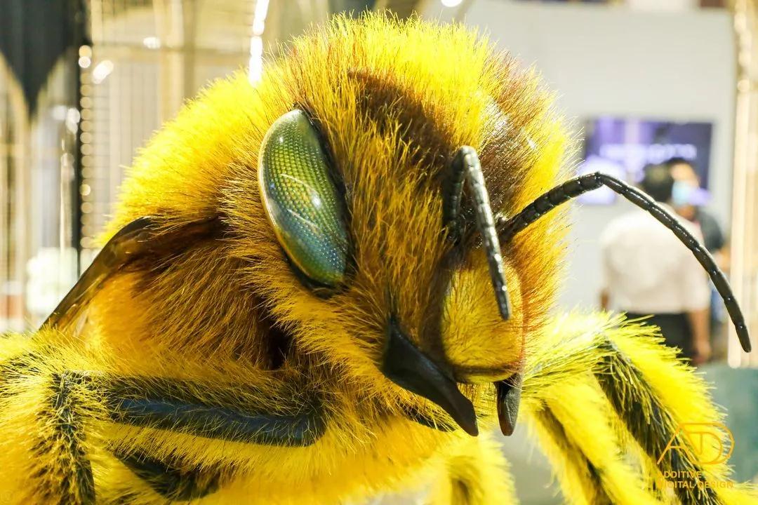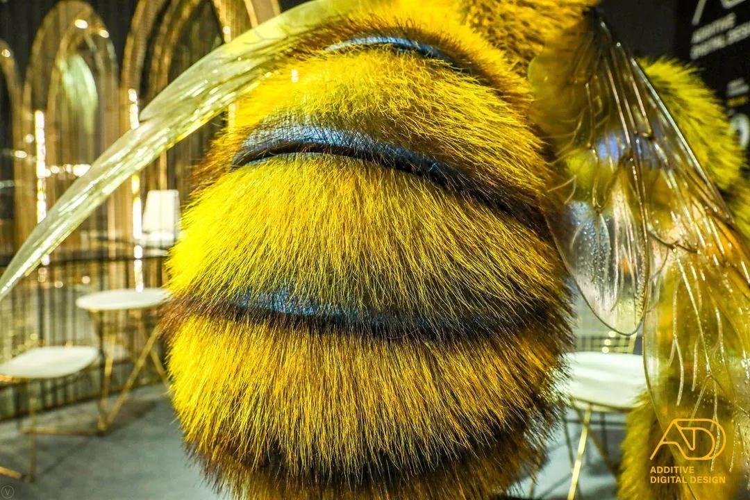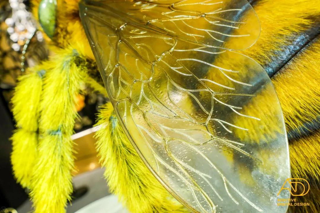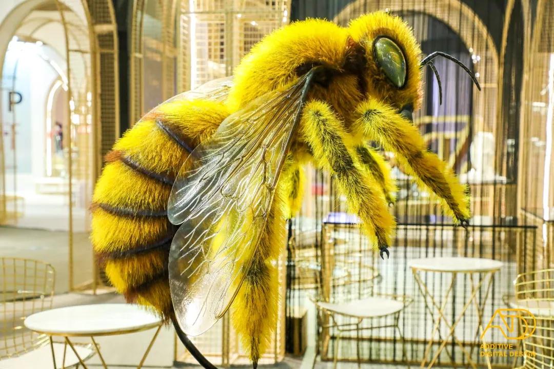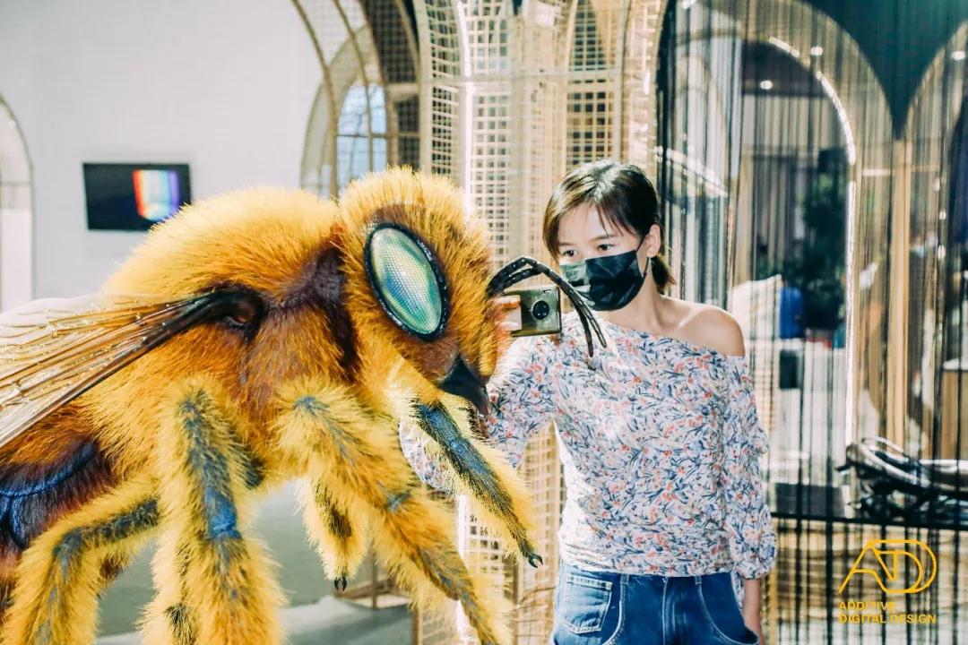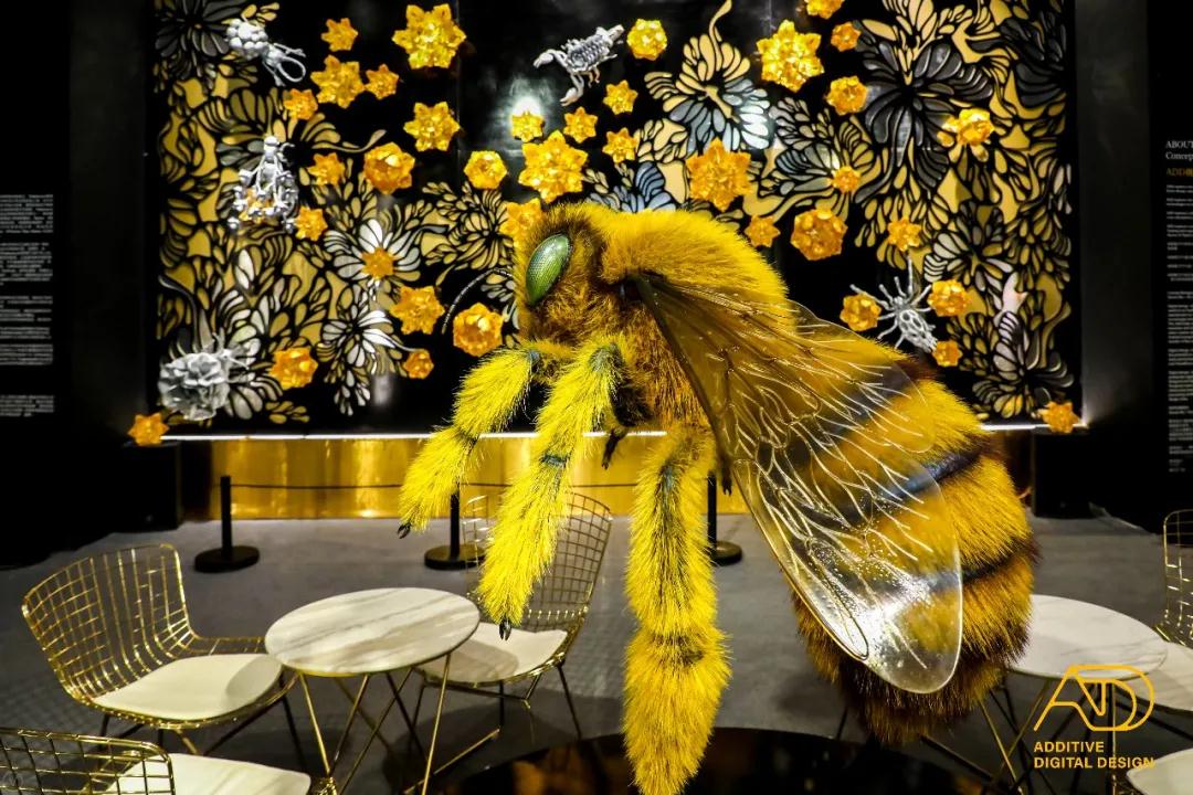 此外展区一侧还展出了由“极致盛放Xuberance"青年设计师陈哲中设计的3D打印艺术墙面以及极致盛放与国内知名特效团队——“AJ特效”合作的大型3D打印蜜蜂,梦蝶蹁跹配衬着极致盛放的代表作之一《盛唐篇》系列牡丹花,花丛蜜蜂栩栩如生。