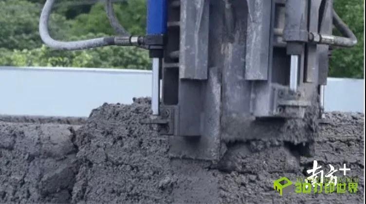 施工现场,3D打印机的打印头架设在X轴、Y轴、Z轴上,以便对其进行准确的空间定位。工人们往打印头注入混凝土后,打印头根据在软件中预设好的打印路径,开始环绕着墙体,一层层地挤出规整的混凝土。仅10分钟的时间,电房墙体的高度便上升了6厘米。