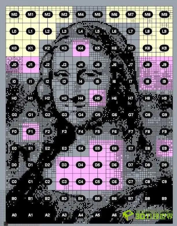 3D打印《蒙娜丽莎》像素画,通过SLS激光选区烧结尼龙材料,共制成130片单元,每片单元350mm*350mm*45mm。这幅画背后开发了一整套图像自动转化,AI自动分形,电脑自动建模,生产批量3D打印文件的系统,它可以将任意图片按照需要的元素自动分形,优化。先将原画分解成130片,再将每片分解成5种小单元。通过AI方法,就可以将任意画面分解成希望得到的元素。完成自动建模的3D模型文件,每片模型左上角都会生成编号,以便生产和组装。