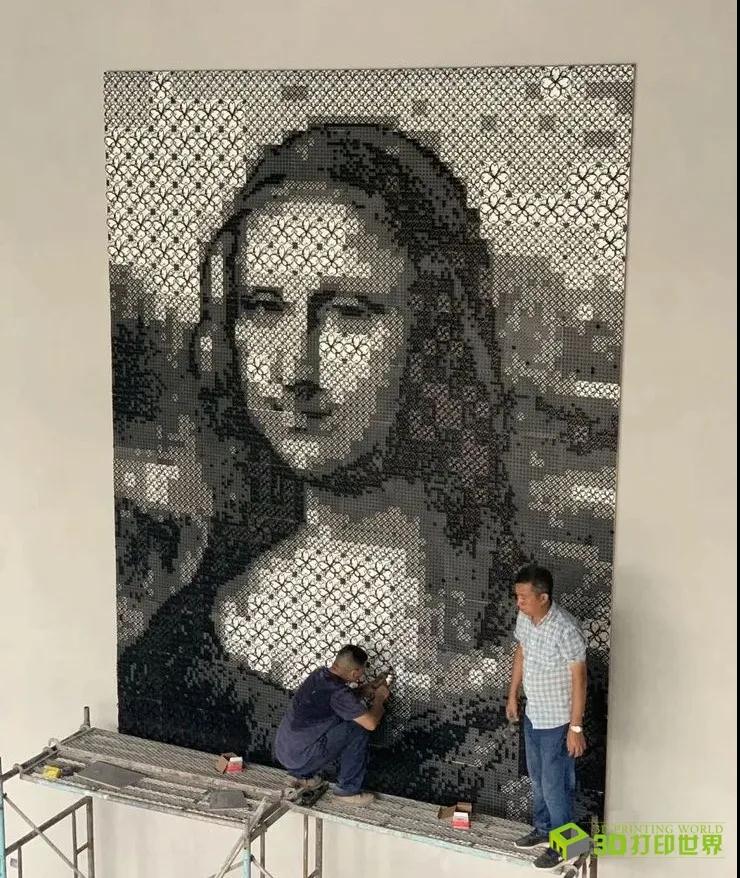 这幅为纪念达芬奇的3D打印《蒙娜丽莎》展示在上海智慧湾科创园四期主楼大厅中,总体尺寸为4550mm*3500mm*45mm,是目前全球最大的3D打印像素画。