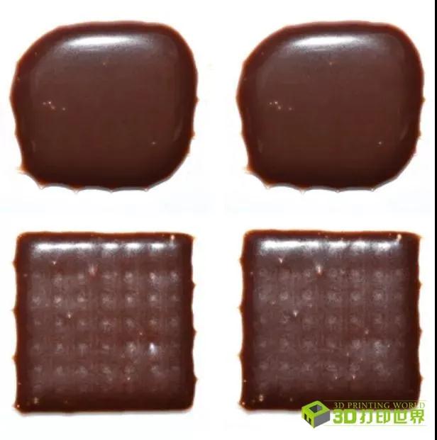 而使用Ci3DP方法,将容易获得的巧克力产品(如糖浆和糊状物)与可可粉混合,以改变墨水的流变性。具有高浓度可可粉的巧克力基油墨具有高粘度的剪切稀化特性。油墨还具有类似牙膏的特性,在静止时不会流动。