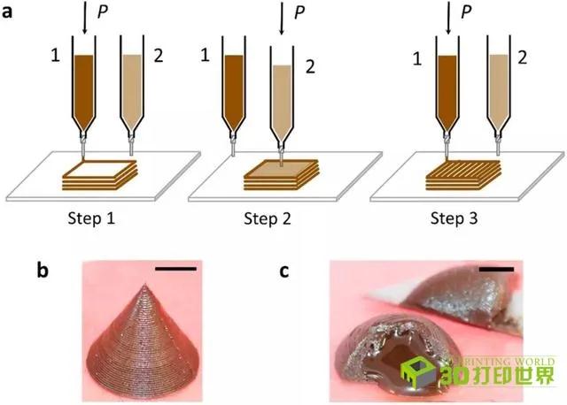多材料食品Ci3DP。(a)室温下多种食物材料的DIW涉及的步骤示意图。步骤的顺序允许打印带有内部填充物的巧克力。(b)包含液体巧克力糖浆作为填充物的锥形外壳的3D结构。(c)突出显示从3D打印外壳流出的液态巧克力糖浆的光学图像。比例尺= 1 cm。
